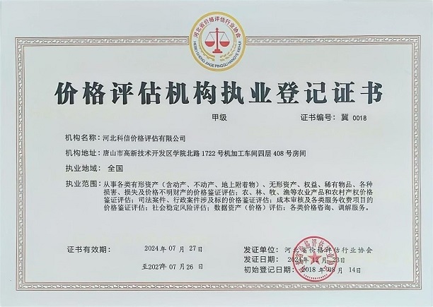 河北科信價格評估有限公司為"AAA"級信用企業,具有商務部、文化部備案,頒發相關鑒定與專業評估資質,由河北省價格評估行業協會頒發的“甲級”《價格評估機構執業登記證書》。公司是河北省價格評估行業協會常務理事單位,河北省科技型中小企業,河北省政府中介超市入冊鑒定評估機構、唐山市政府中介超市入冊的鑒定評估機構、唐山仲裁委員會入冊鑒定評估機構。依法在唐山工商行政管理部門注冊登記的獨立第三方評估機構。公司成立于2015年,注冊資金300萬元人民幣,公司擁有多名價格鑒證師、價格評估專業人員、國家高級、中級機動車鑒定評估師、中級涉案財物評估師、汽車估損師、保險公估師、高級林業工程師等,為您提供專業優質的服務,公司嚴格按照程序組織實施鑒定評估以及合法的市場調查業務,所出具的價格評估報告書、意見書具有法律效力并為國家認可。公司自成立以來共接受河北省交警系統、法院系統、檢察院系統、交通局系統、財政系統、銀行系統以及社會各界人士的各類委托3000余件,受到一致好評。在執業過程中,我們將依照相關的法律、法規,嚴格遵循客觀、獨立、公正、公平、科學性的原則;竭誠為您提供專業、權威的價格評估服務和信息咨詢服務;為您提供專業、快捷的優質服務。